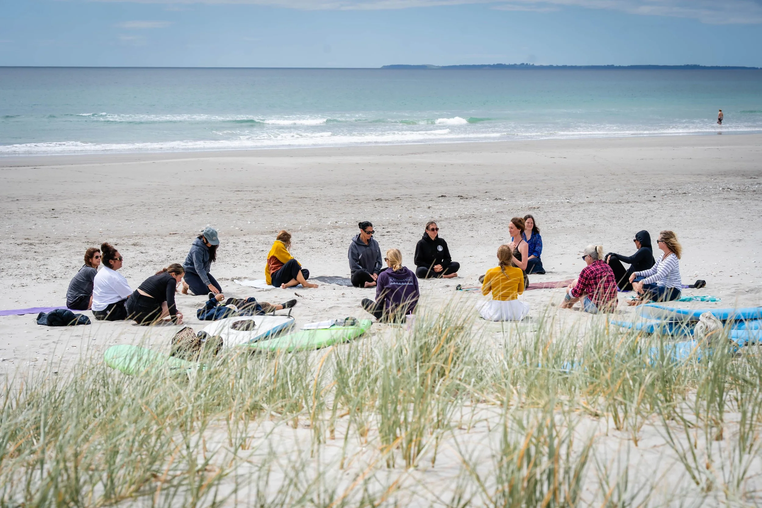 Sessions begin with the women arriving and catching up informally. We then gather in a circle to check in - sharing what’s alive for us that morning and what we might want to leave on land before heading into the water. Each week, we introduce and discuss a theme connected to both surfing and living well as women. From there the flow of the session looks like this: we do yoga on the beach, then we get changed and go over surf instruction from Kristin, then we surf.